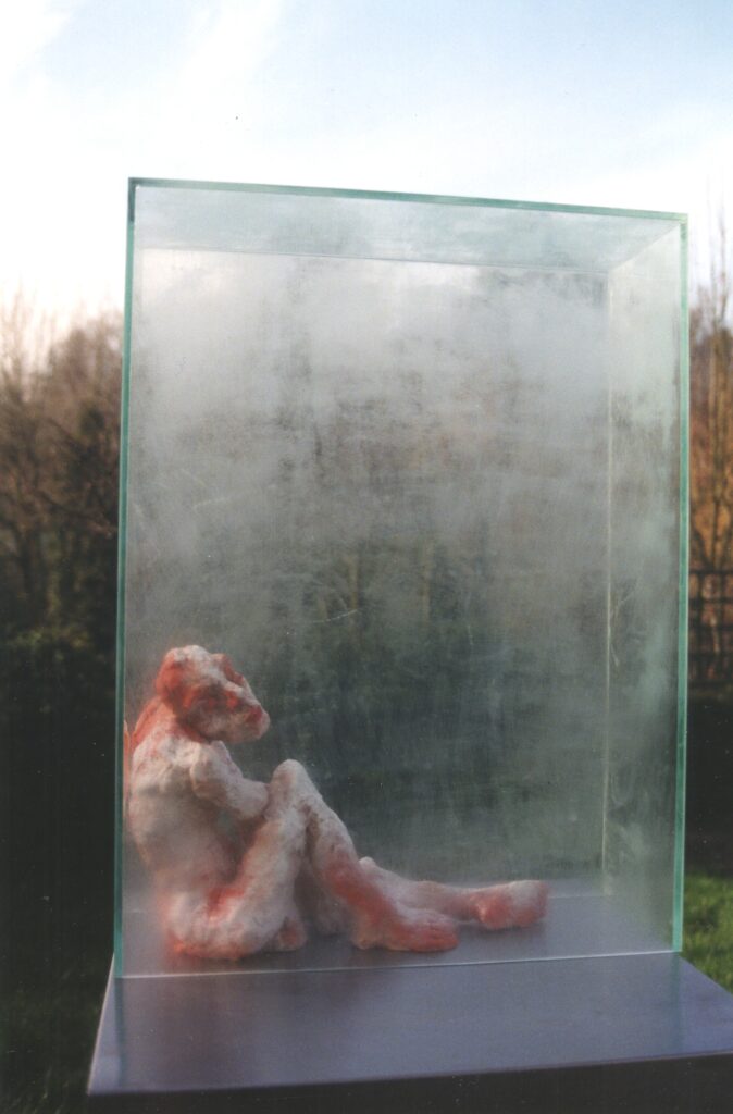 J’ai donc conçu une cage en verre, sorte de mur transparent. Le personnage qui se tient à l'intérieur semble sourd à ce qu'on lui murmure. Ce qu'on lui murmure est gravé sur les côtés de la cage en verre, en vain, puisque le destinataire se refuse à l'entendre.