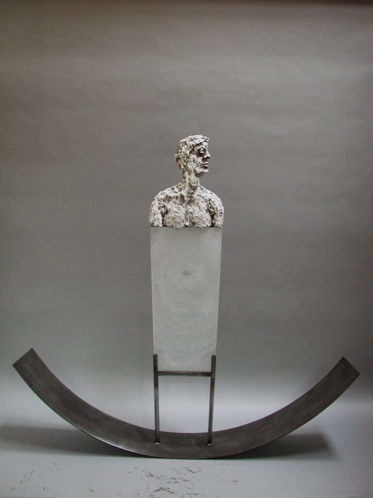C’est en référence au philosophe Levinas, dit « philosophe de l’altérité », que je conçus cette pièce : « l’autre, par sa seule présence, me déloge de moi-même ». D’où le croisement des matériaux. Une gravure sur le même sujet, est appelée « délogé ».